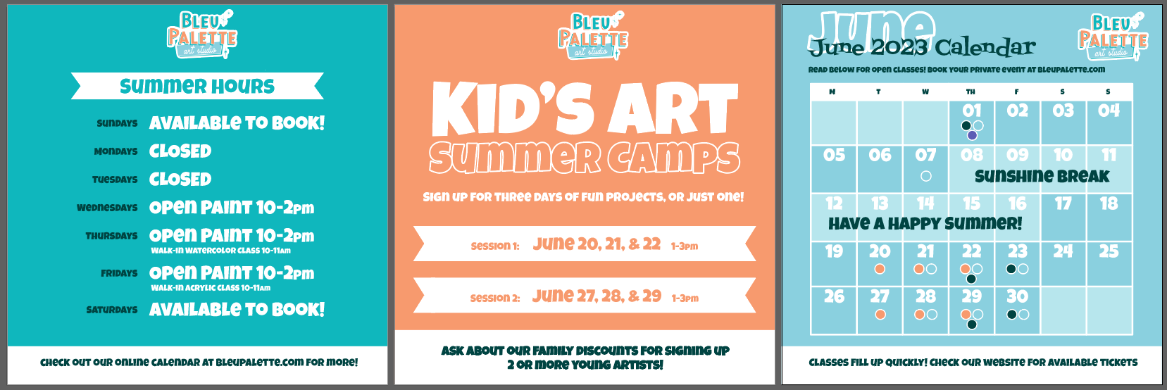 I collaborated with Bleu Palette art studio to upgrade their web design and branding for in-store signage and social media. I worked to create a new page on their website that displays a comprehensive view of the paint class offerings, making it easier for customers and teachers alike to access the information they need. Bleu Palette also needed to extend their fun brand identity into their physical space. To address this, we worked together to create fun and eye-catching signage to display throughout the gallery and studio with instructions for customers. We also added a touch of whimsy to their in-store product displays with fun characters, bringing the gallery's brand to life and creating a memorable experience for customers. This translated to their social media as well.With these changes, Bleu Palette is able to better showcase their offerings and create a cohesive brand experience across their website, social media, and physical store. This project allowed me to use my skills in visual design to create a unique and effective solution for a local small business.